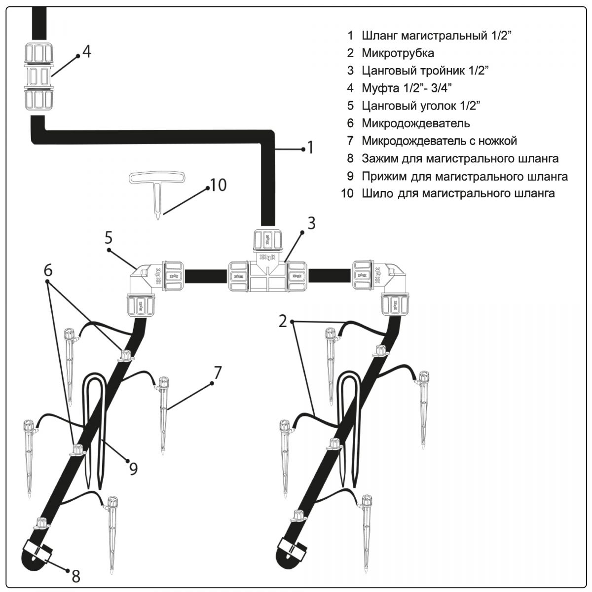 Комплект микродождевого полива предназначен для направленного полива кустарников и деревьев. Предусмотрена возможность регулировки диаметра. Зоны полива в диапазоне 10-30 см. Микродождеватель устанавливается на магистральный шланг, а микродождеватель с ножкой устанавливается в стороне от магистрального шланга и подключается к нему через микротрубку. Съёмный регулируемый наконечник дождевателя легко прочистить в случае его засорения.
