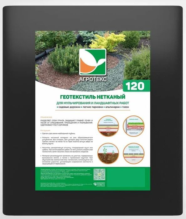 Агротекс Гео – нетканый материал для ландшафтных работ. Садовый геотекстиль разработан специально для проведения различных работ на приусадебных участках. Его применение позволяет реже восстанавливать слой плодородной земли или декоративной отсыпки, снижает частоту проведения ремонта садовых дорожек, альпинариев и газонов, сдерживает рост сорняков. Все изделия Агротекс Гео изготовлены из нетканого материала с добавлением УФ-стабилизатора. Агротекс Гео плотностью 120 г/м2 подходит для газонов, альпинариев, садовых дорожек и легких парковок.