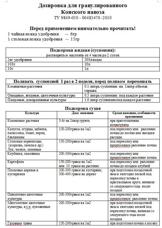 Удобрения из конского навоза Оргавит Конский N-P-K 2.55%-3.16%-2.53% Конский навоз ценится больше всех остальных, потому что обладает огромным количеством полезных веществ для культурных насаждений и считается лучшим удобрением для истощенной ежегодными посадками растений почвы. По степени концентрации полезных элементов именно этот навоз стоит на первом месте, опережая куриный, коровий и любой другой. Один недостаток — он редкий и малодоступен большинству фермеров. Далеко не каждый может найти такое удобрение для своего участка. Но есть другой способ использовать на участке конский навоз — купить гранулированную форму этого удобрения. Компания ООО «Микробиосинтез» разработала уникальные технологии, благодаря которым удалось, сохранив питательные вещества, облечь навоз в компактные, лишенные неприятного запаха гранулы. «Оргавит» конский — кладезь витаминов для насаждений, обладающий массой неоспоримых преимуществ: Оптимальным балансом минералов, микро- и макроэлементов. Рыхлостью, улучшающей структуру почвы. Компактными размерами — на 1 кг такого удобрения приходится столько же микроэлементов, сколько находится в 4-5 кг натурального навоза. Температурой распада около 70 градусов по Цельсию, что позволяет использовать удобрение в качестве подогрева грядок: на открытом грунте и в теплице. Гранулы постепенно высвобождают находящиеся в них вещества, благодаря чему растения получают подкормку в течение всего огородного сезона. Кроме того, за счет пористой структуры гранулированный конский навоз накапливает влагу и отдает ее насаждениям в засушливый период. В результате растения не испытывают недостатка ни в чем. В составе Оргавита — необходимое количество азота, калия, фосфора и кальция, в которых нуждаются все огородные насаждения. Поэтому удобрение универсально — одинаково хорошо подходит для совершенно разных огородных культур: корнеплодов, ягод, кустарников. Использовать такую форму удобрения гораздо удобнее и комфортнее, чем закладывать пласт свежего навоза. Хранится такое удобрение легко — в течение 3-4 сезонов, сохраняя все имеющиеся в нем вещества. Органический конский навоз купить в гранулированном виде выгодно не только владельцам подсобных хозяйств, но и крупным фермерам. Состав Подстилочный конский навоз 100% Подкормка жидкая (суспензия) Растворить и настоять от 4 часов до 2 суток. 2кг удобрения - 200л воды 100г - 10л 10г - 1л Поливать суспензией 1 раз в 2 недели, перед поливом перемешать Комнатные растения - 0.1 литра суспензии на 1литр объема горшка Овощные, ягодные, цветочные культуры - 0.5 литра суспензии под каждое растение Плодовые, декоративные культуры - 1.0 литр суспензии под каждое растение Подкормка сухая Комнатные растения - 3-4г на 1литр грунта при приготовлении почвогрунта Капуста, огурцы, кабачки, патиссоны, томат, перец, баклажаны - 150-200грамм на 1м2 под перекопку или рыхление почвы до посева или высадки рассады Столовые корнеплоды (морковь, свекла и др.), лук, чеснок, зеленные - 150-200грамм на 1м2 под перекопку или предпосевное рыхление почвы Клубника, земляника - 200-300грамм на 1м2 под перекопку или предпосевное рыхление почвы Картофель - 150-200 грамм на 1м2 или 10 грамм на растение под перекопку или рыхление почвы до посадки клубней Плодовые деревья и кустарники - 200-300 грамм на кустарник, 300-400 грамм на дерево при подготовке 