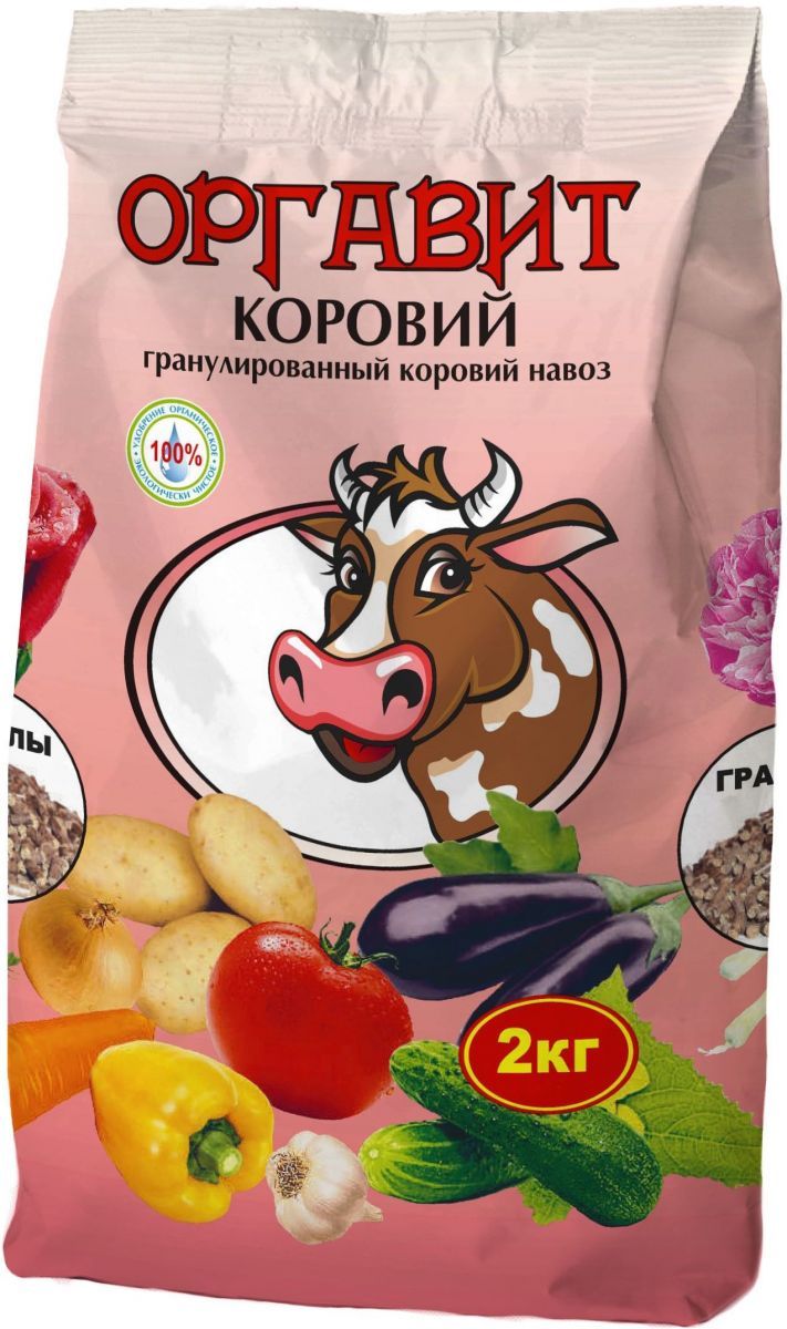 Удобрение «Оргавит» на основе коровьего навоза лишено таких недостатков. Полезные вещества из органической массы сконцентрированы в компактных гранулах, которые: Не имеют неприятного запаха, не пачкаются и не нуждаются в особых условиях хранения. Обеспечивают оптимальное сочетание полезных веществ, которых не хватает растениям в истощенной многолетними урожаями почве: азота, калия, кальция, фосфора, магния и прочих микро- и макроэлементов. Не содержат патогенных организмов и семян сорняков, которых в избытке в обычном удобрении. Обеспечивают постепенное поступление питательных веществ в почву, благодаря чему растения получают микроэлементы в течение всего периода роста. Немного повышают температуру грунта, позволяя высаживать рассаду раньше. Оргавит Концентрация полезных веществ в "Оргавит" Коровий в 4 раза выше, чем в живом навозе. Это значит, что вносить «Оргавит» коровий в почву нужно в небольших количествах, что значительно облегчает труд по удобрению почвы. При этом соблюдать дозировку и следова