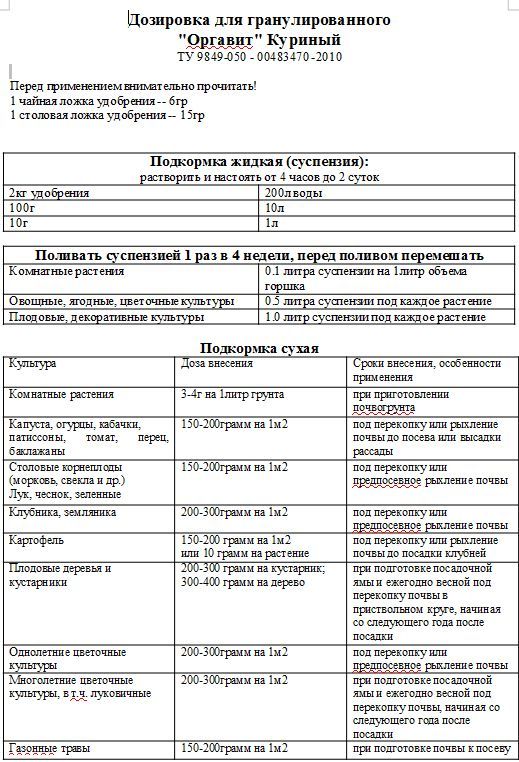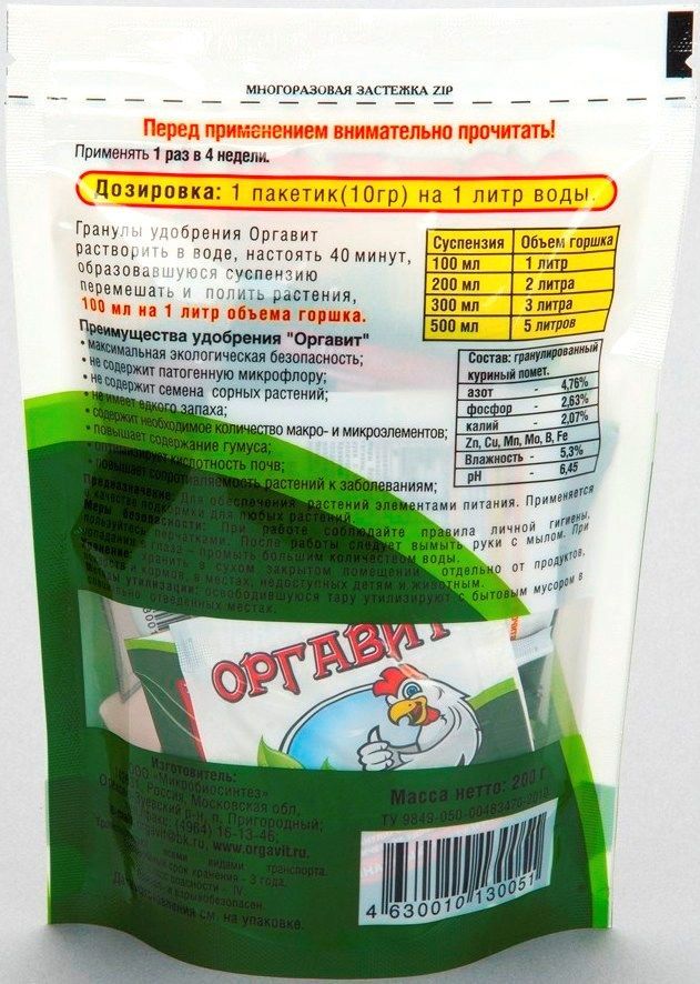 Удобрения из куриного помета Оргавит Куриный 2 кг N-P-K 4.76% - 2.63%-2.07% Куриный помет ценен для культурных растений благодаря богатству полезных веществ и витаминов. Однако использовать его на участке не так просто. Во-первых, возникают сложности с его хранением — не желательно долго держать его без использования, иначе удобрение превратится в яд. Во-вторых, в чистом виде помет куриный не вносится — необходимо готовить настойки разной консистенции. А это довольно трудоемко и долго. Гораздо проще использовать удобрение из куриного помета в гранулах. Они лишены недостатков живого навоза, но при этом сохраняют все его преимущества и питательные свойства. Его можно вносить в качестве жидкой подкормки или в сухом виде, что облегчает поступление веществ в почву. Оргавит Вот лишь несколько причин купить гранулированный куриный помет: Удобное и долгое хранение: остаток можно использовать в следующий сезон. Нет неприятного запаха и дискомфорта в использовании: забудьте об устойчивом отвращении, появляющемся при работе с живым навозом. В процессе обработки устраняются жизнеспособные семена растений, патогенные организмы и возбудители заболеваний: это снижает вероятность гибели насаждений из-за неведомых болезней. Гранулы при контакте с водой разбухают: влага сохраняется для последующих засушливых периодов. Не возникает проблем с дозировкой: гранулированный куриный помет можно добавлять локально в небольших количествах. «Оргавит» куриный в отличие от аналогичных продуктов содержит большую концентрацию питательных веществ. Это обусловливает экономичность удобрения: для обогащения участка понадобится меньше навоза. Оргавит Куриный ускоряет созревание плодов и увеличивающий урожайность на 30-50%. Подстилочный куриный помет 100% Способы применения Перед применением внимательно прочитать! 1 чайная ложка удобрения - 6гр 1 столовая ложка удобрения - 15гр Подкормка жидкая (суспензия) Растворить и настоять от 4 часов до 2 суток. 2кг удобрения - 200л воды 100г - 10л 10г - 1л Поливать суспензией 1 раз в 4 недели, перед поливом перемешать. Комнатные растения - 0.1 литра суспензии на 1литр объема горшка Овощные, ягодные, цветочные культуры - 0.5 литра суспензии под каждое растение. Плодовые, декоративные культуры - 1.0 литр суспензии под каждое растение. Подкормка сухая Комнатные растения - 3-4г на 1литр грунта при приготовлении почвогрунта. Капуста, огурцы, кабачки, патиссоны, томат, перец, баклажаны - 150-200грамм на 1м2 под перекопку или рыхление почвы до посева или высадки рассады. Столовые корнеплоды (морковь, свекла и др.), лук, чеснок, зеленные - 150-200грамм на 1м2 под перекопку или предпосевное рыхление почвы Клубника, земляника - 200-300грамм на 1м2 под перекопку или предпосевное рыхление почвы. Картофель - 150-200 грамм на 1м2 или 10 грамм на растение под перекопку или рыхление почвы до посадки клубней Плодовые деревья и кустарники - 200-300 грамм на кустарник, 300-400 грамм на дерево при подготовке посадочной ямы и ежегодно весной под перекопку почвы в приствольном круге, начиная со следующего года после посадки. Однолетние цветочные культуры - 200-300грамм на 1м2 под перекопку или предпосевное рыхление почвы Многолетние цветочные культуры, в т.ч. луковичные - 200-300грамм на 1м2 при подготовке посадочной ямы и ежегодно весной под перекопку почвы, начиная со следующего года после посадки. Г